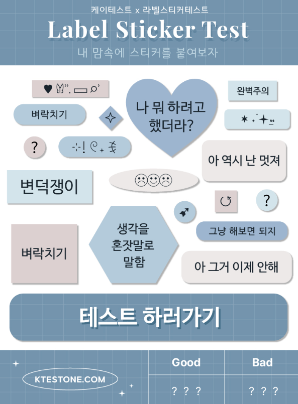 케이테스트 홈페이지에서 라벨 스티커 테스트를 실시할 수 있으며, 이 홈페이지에는 여러가지 심리테스트 및 MBTI 성격 유형 관련 테스트가 많이 있으며, 요즘 유행하고 재미있는 테스트들을 할 수 있습니다.
