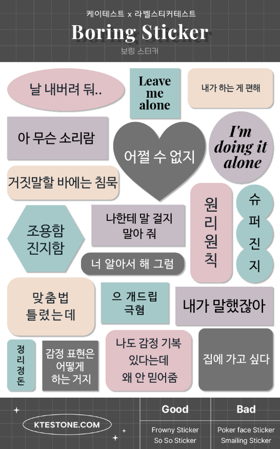 보링 스티커와 프로우니 스티커, 쏘쏘 스티커와 잘 맞으며, 포커페이스 스티커와 스마일링 스티커와는 나쁘다는 결과가 나왔습니다.
