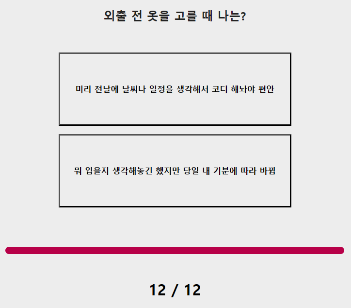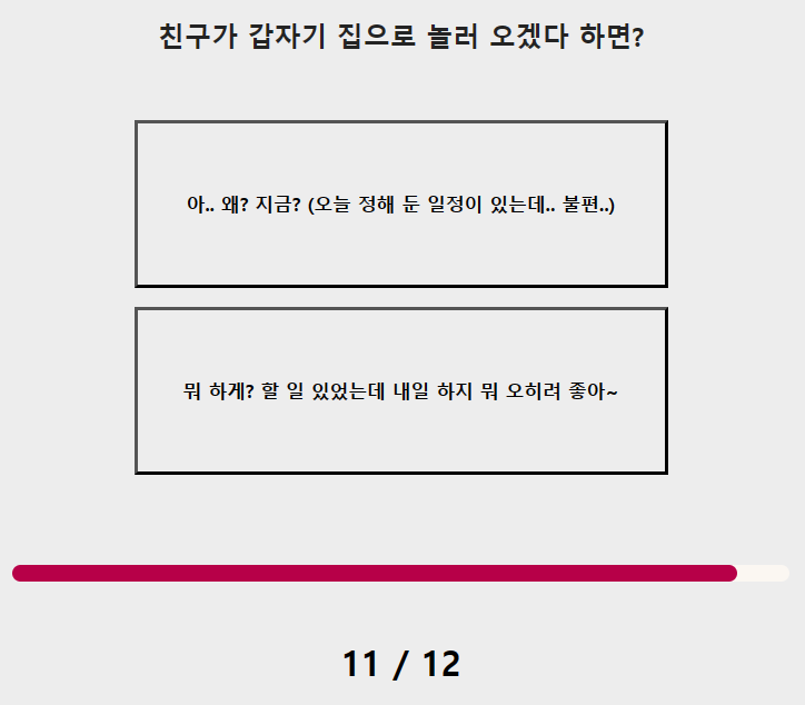 11. 친구가 갑자기 집으로 놀러 오겠다 하면? 12. 외출 전 옷을 고를 때 나는?