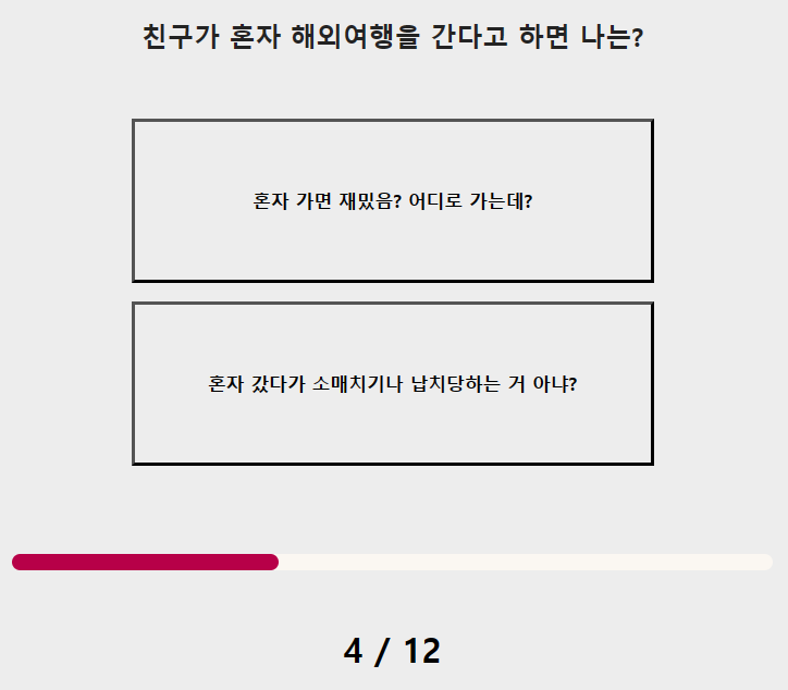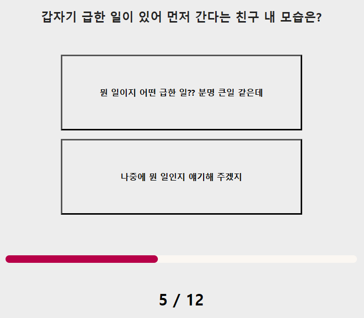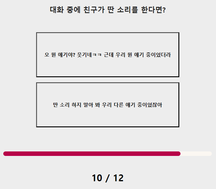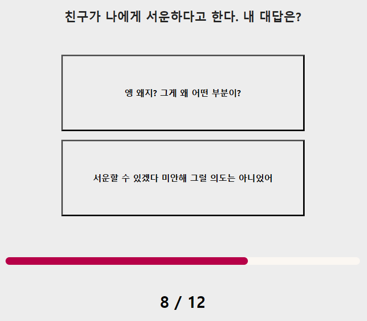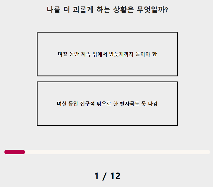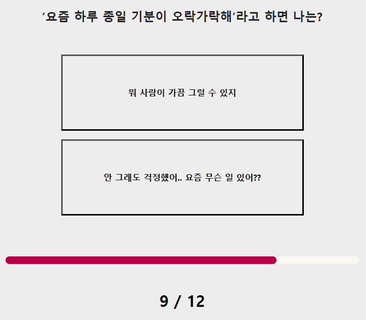 감정 그래프 테스트 문항 수는 총 12가지이며, 소요시간은 약 2분에서 3분 정도 걸립니다.