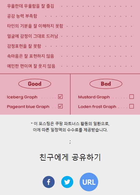 감정 그래프 테스트 12문제를 다 체크하셨다면 결과를 알아볼 수 있으며, 테스트 결과를 확인 하려면 쿠팡(광고)를 클릭하신 다음 결과 창이 나오며, 자신의 감정 그래프 테스트 결과를 알아볼 수 있습니다.