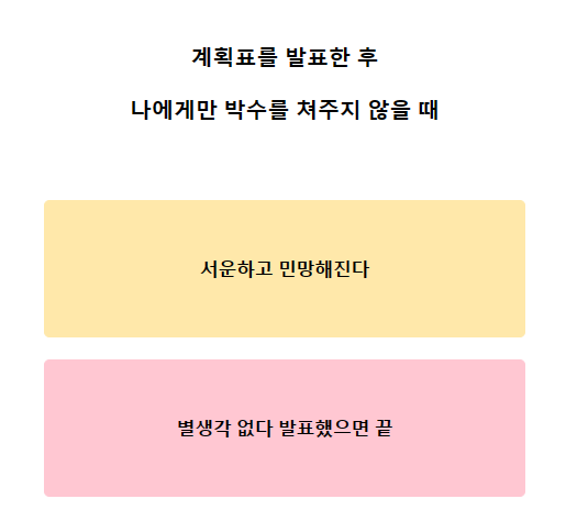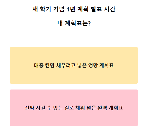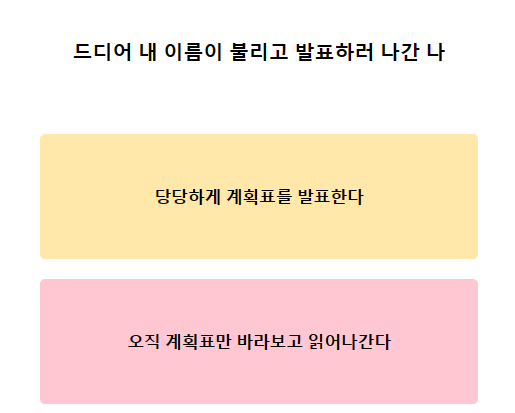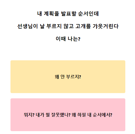 5. 내 계획을 발표할 순서인데 선생님이 날 부르지 않고 고개를 갸웃거린다. 이때 나는? 6. 드디어 내 이름이 불리고 발표하러 나간 나는?