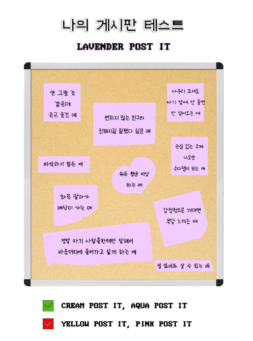 나의 게시판 테스트 결과는 '라벤더 포스트잇(Lavender Post It)'이 나왔습니다.