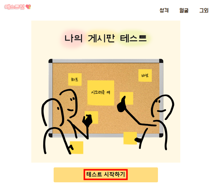 이 테스트는 게시판 포스트잇이 붙여져서 자신의 성격 유형을 알아볼 수 있는 테스트입니다. '테스트잇' 홈페이지에 방문하시면 나의 게시판 테스트를 실시할 수 있습니다.