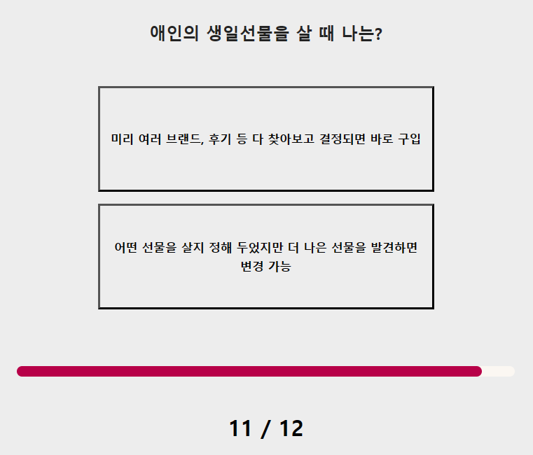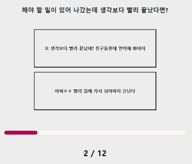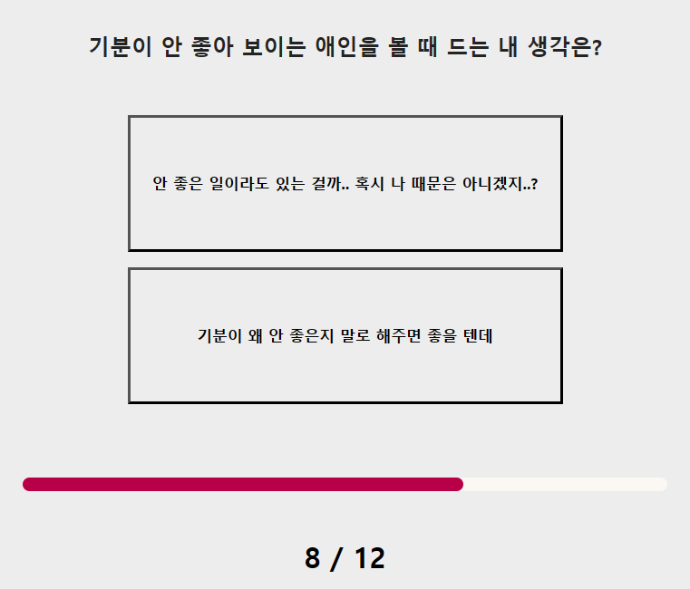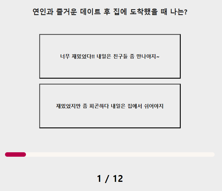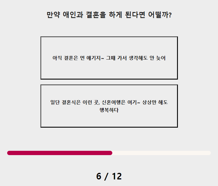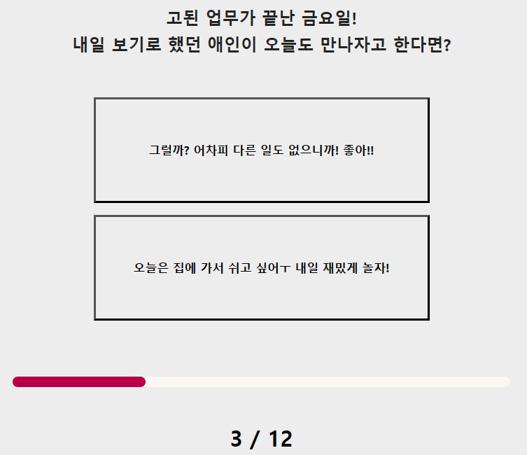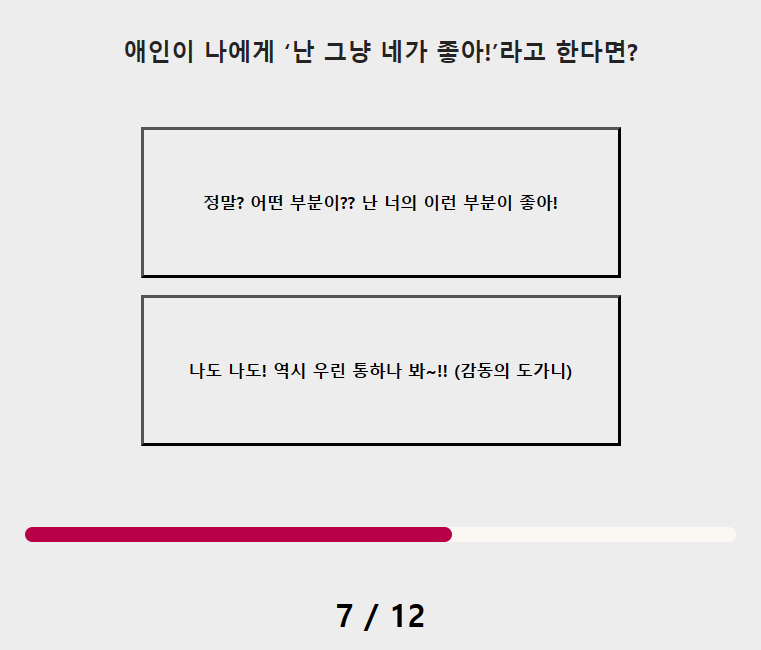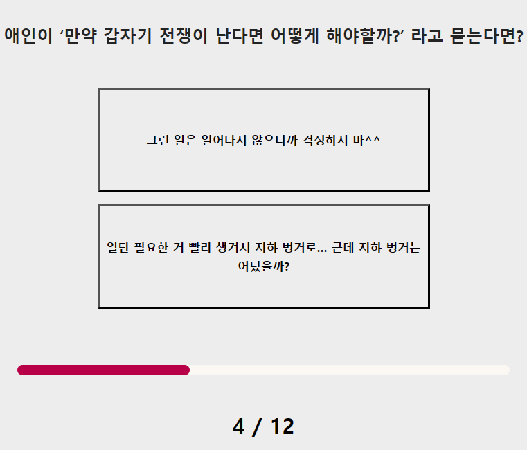 연애 이용권 테스트 문항 수는 총 12가지이며, 소요시간은 약 2분에서 3분 정도 걸립니다.