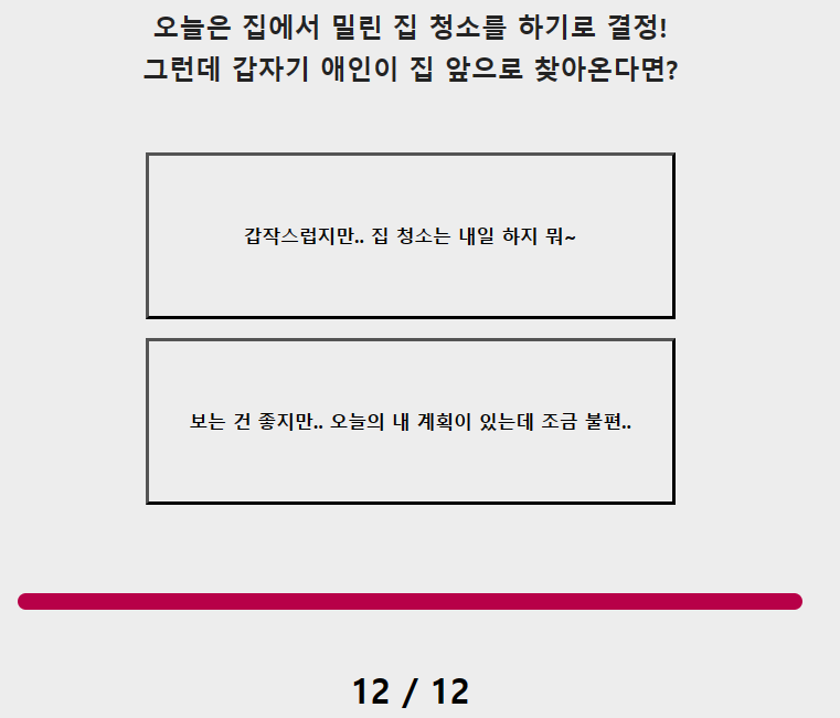11. 애인의 생일선물을 살 때 나는? 12. 오늘은 집에서 밀린 집 청소를 하기로 결정! 그런데 갑자기 애인이 집 앞으로 찾아온다면?