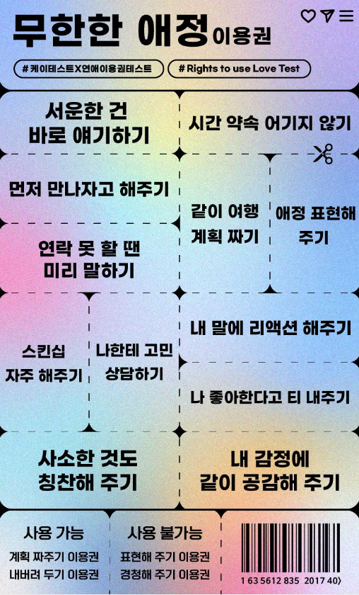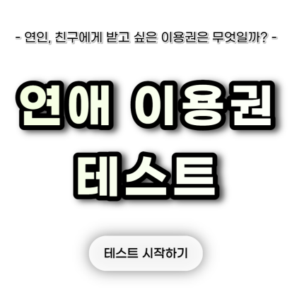 연애 이용권 테스트는 연인에게나 친구에게 받고 싶은 이용권은 무엇일지 알아보는 테스트입니다.