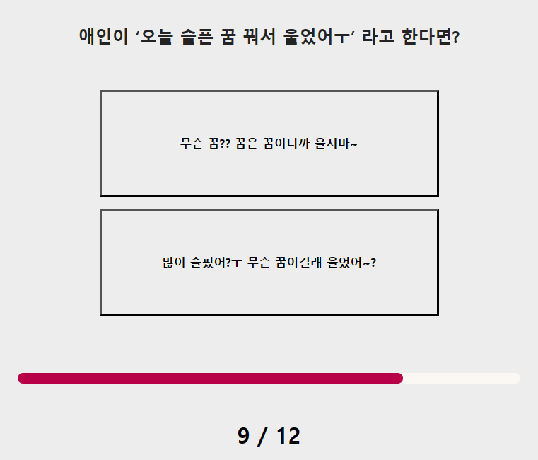 9. 애인이 '오늘 슬픈 꿈 꿔서 울었어ㅜ'라고 한다면? 10. 연인과 기념일이 2주 뒤라면?