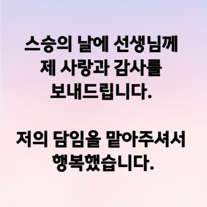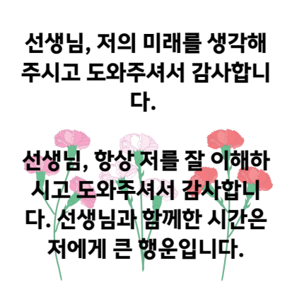 - 선생님의 친절함과 헌신으로 저의 인생에 큰 변화를 가져다 주셨습니다. 행복한 스승의날 되시길 바랍니다. 선생님의 끊임없는 지지와 격려로 목표를 향해 나아갈 수 있었습니다.