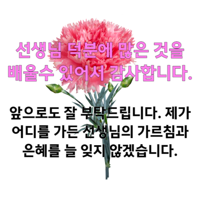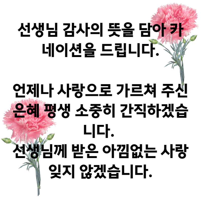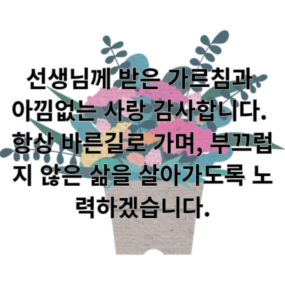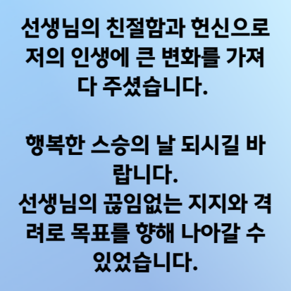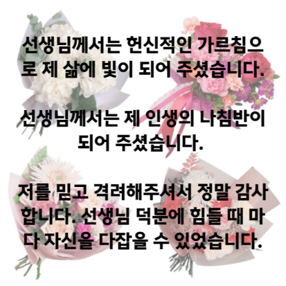 - 많은 사람들 중에서 선생님과 제자로 만나서 특별한 인연이라 생각하며, 소중하고 감사한 마음이 더욱 더 느껴집니다. 평소에 쑥쓰러워서 말씀드리지 못했지만 감사하고 사랑한다는 말을 꼭 전하고 싶었습니다.