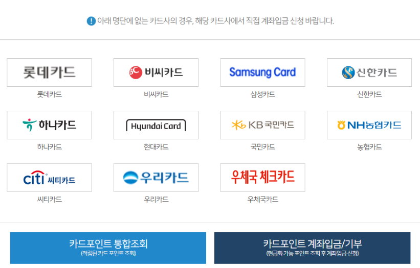 여신금융협회 카드포인트 통합조회가 가능한 카드사는 총 11곳인데요. 롯데, 비씨, 삼성, 신한, 하나, 현대, 국민, 농협, 씨티, 우리, 우체국카드입니다.
