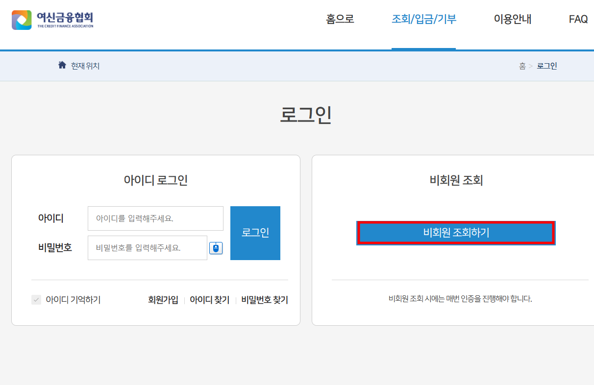 여신금융협회에 회원가입이 되어 있는 분들은 로그인을 하시면 되므로, 만약 여신금융협회를 처음 이용하시는 분들이나 가입이 안되어 있는 분들은 비회원 조회하기를 통해서 간편하게 조회하실 수 있습니다. 비회원 조회하기 버튼을 클릭하신 다음 본인인증을 진행하신 다음 이용하실 수 있습니다.