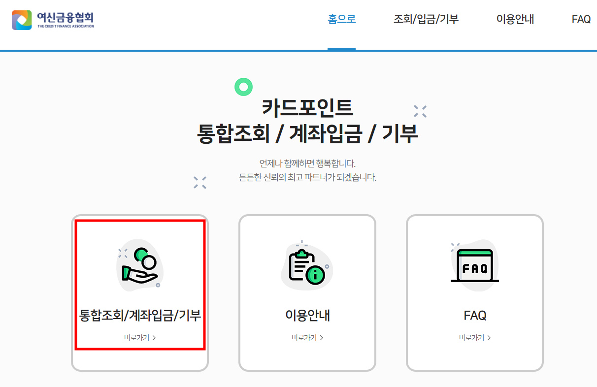 위의 그림은 여신금융협회 홈페이지이며, 홈페이지에서 '통합조회/계좌입금/기부' 버튼을 클릭해주시면 됩니다.