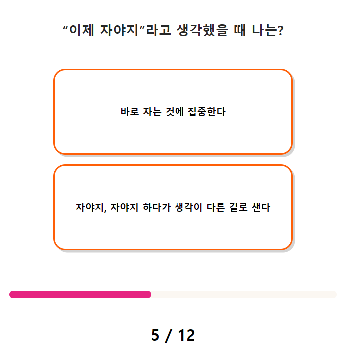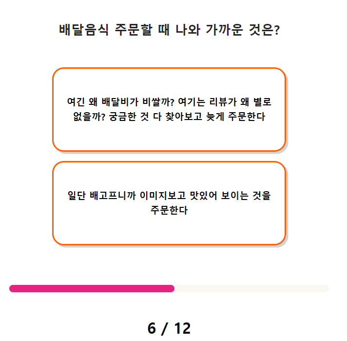 5. "이제 자야지"라고 생각했을 때 나는? 6. 배달 음식 주문할 때 나와 가까운 것은?