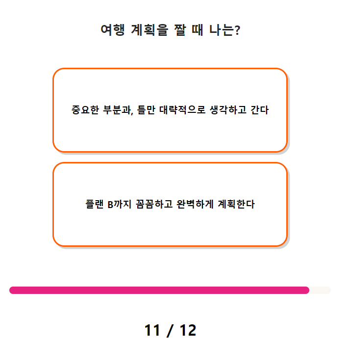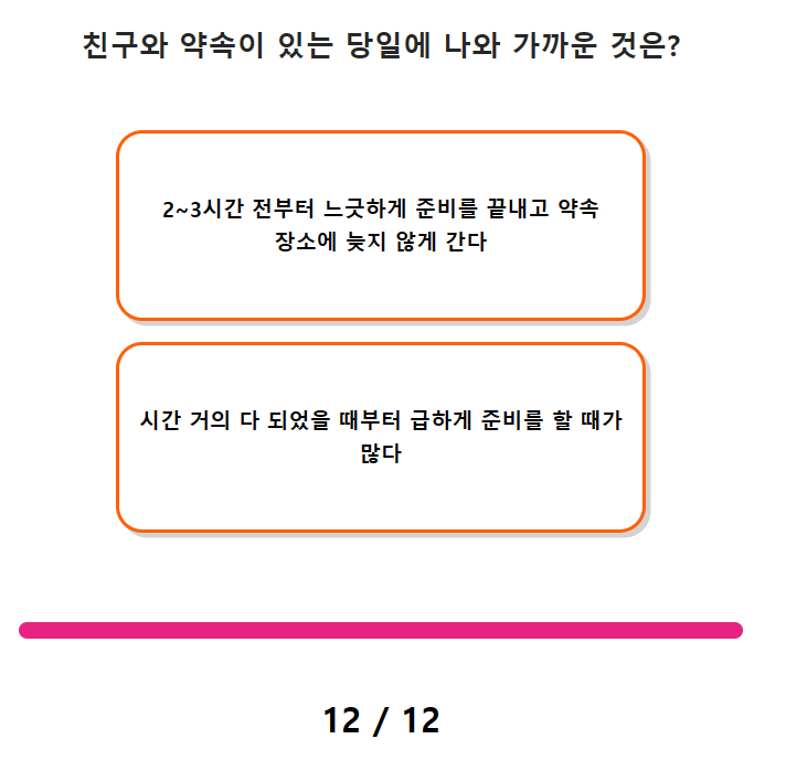11. 여행 계획을 짤 때 나는? 12. 친구와 약속이 있는 당일에 나와 가까운 것은?
