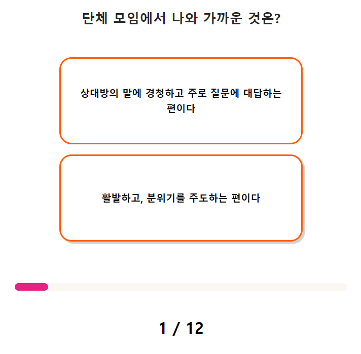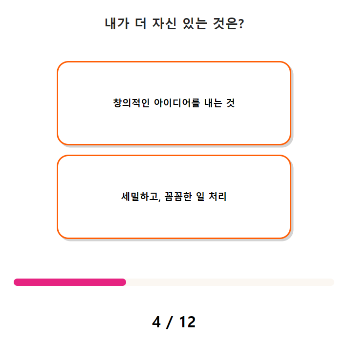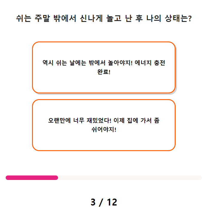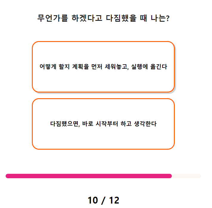 DIY 성격 테스트 문항 수는 총 12가지이며, 소요 시간은 약 2분에서 3분 정도 걸립니다.