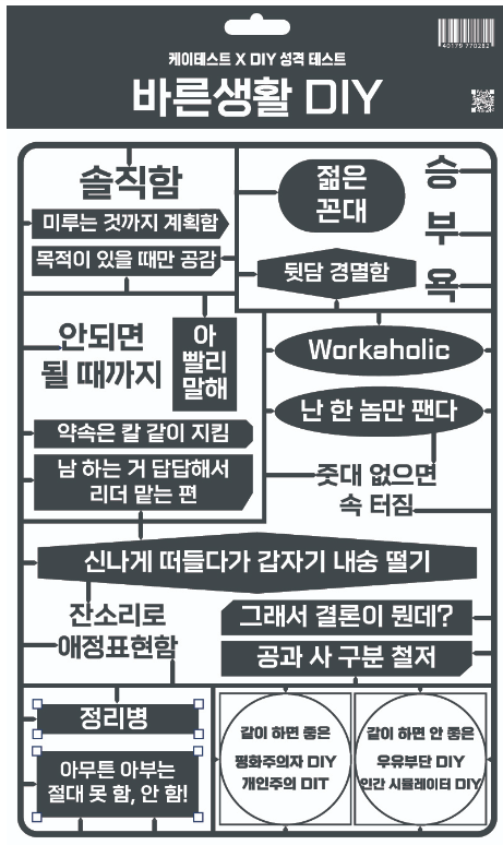 심리 테스트나 성격 테스트는 다들 많이 해보셨을 것 같은데요. 요번에 새로 나온 DIY 성격 테스트가 있습니다. 성격 테스트는 주로 나의 성격이 어떤지 제삼자의 입장에서 정확하게 바라볼 수 있는데요. DIY 성격 테스트는 자신이 테스트를 통해서 직접 만들어보는 나의 성격이라고 볼 수 있습니다.