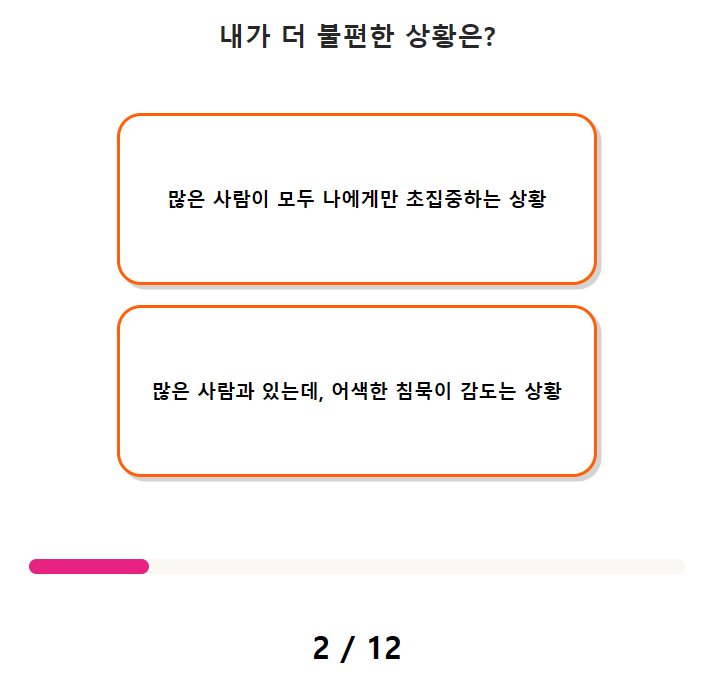 2. 내가 더 불편한 상황은? 1) 많은 사람이 모두 나에게만 초집중하는 상황 2) 많은 사람과 있는데, 어색한 침묵이 감도는 상황
