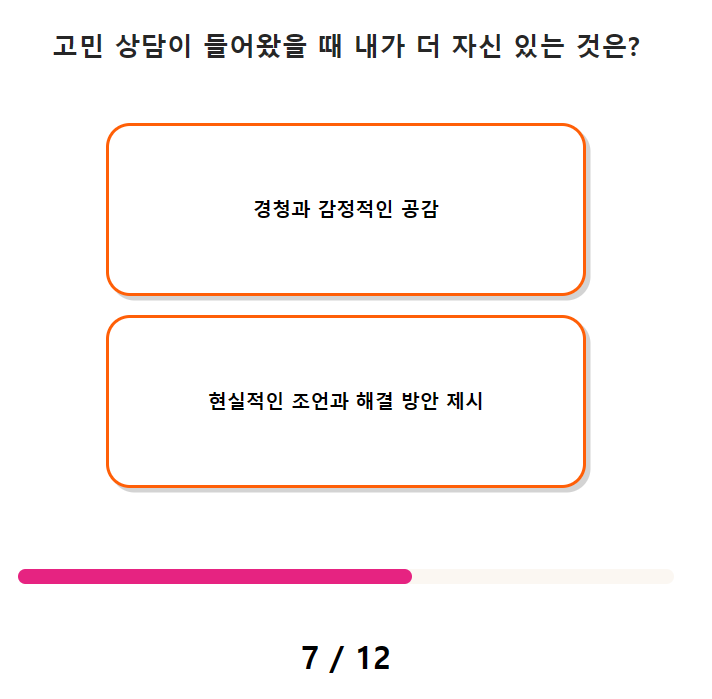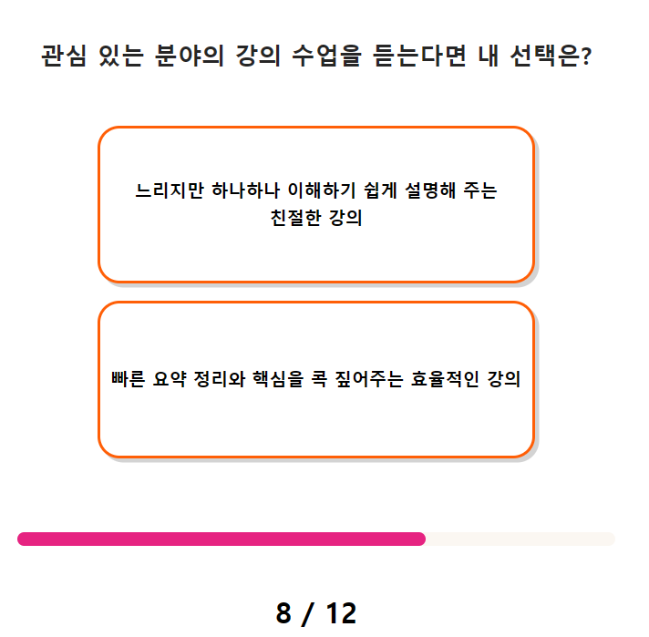 7. 고민 상담이 들어왔을 때 내가 더 자신 있는 것은? 8. 관심 있는 분야의 강의 수업을 듣는다면 내 선택은?