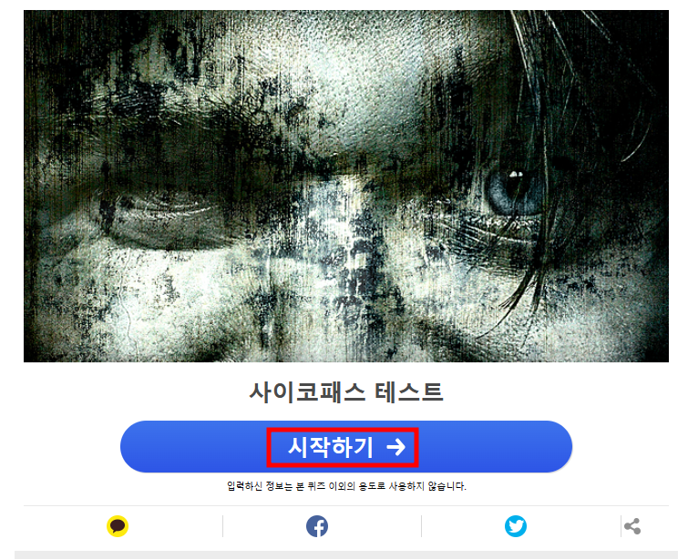 위의 링크를 참고하셔서 vonvon 사이코패스 테스트 사이트에 들어가셔서 '시작하기' 버튼을 클릭하셔서 시작할 수 있습니다.