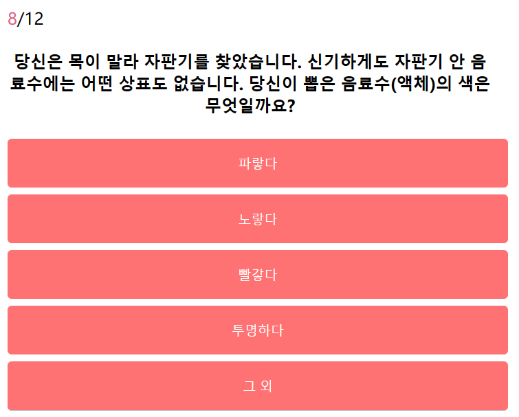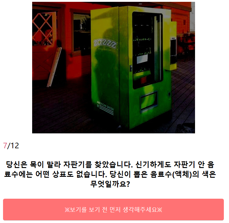 4. 당신은 목이 말라 자판기를 찾았습니다. 신기하게도 자판기 안 음료수에는 어떤 상표도 없습니다. 당신이 뽑은 음료수(액체)의 색은 무엇일까요?