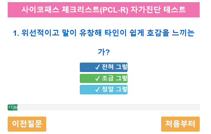 아래의 링크를 참고하셔서 사이코패스 체크리스트 PCL-R 자가진단 테스트를 시작하실 수 있습니다.