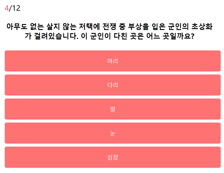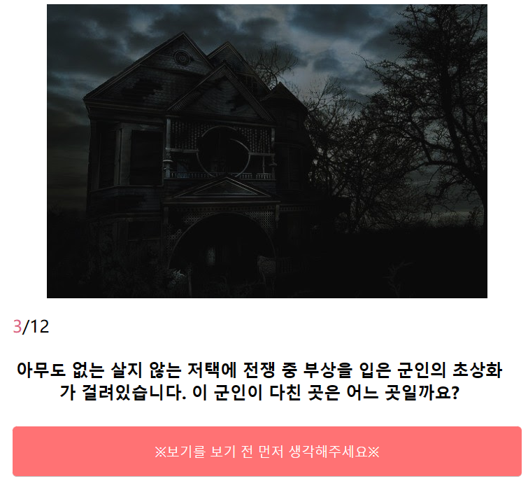 2. 아무도 없는 살지 않는 저택에 전쟁 중 부상을 입은 군인의 초상화가 걸려있습니다. 이 군인이 다친 곳은 어느 곳일까요?
