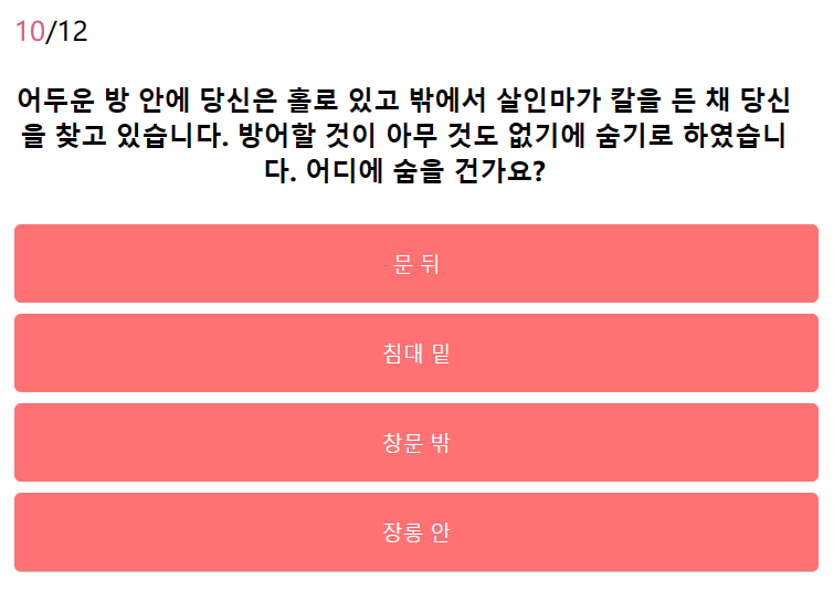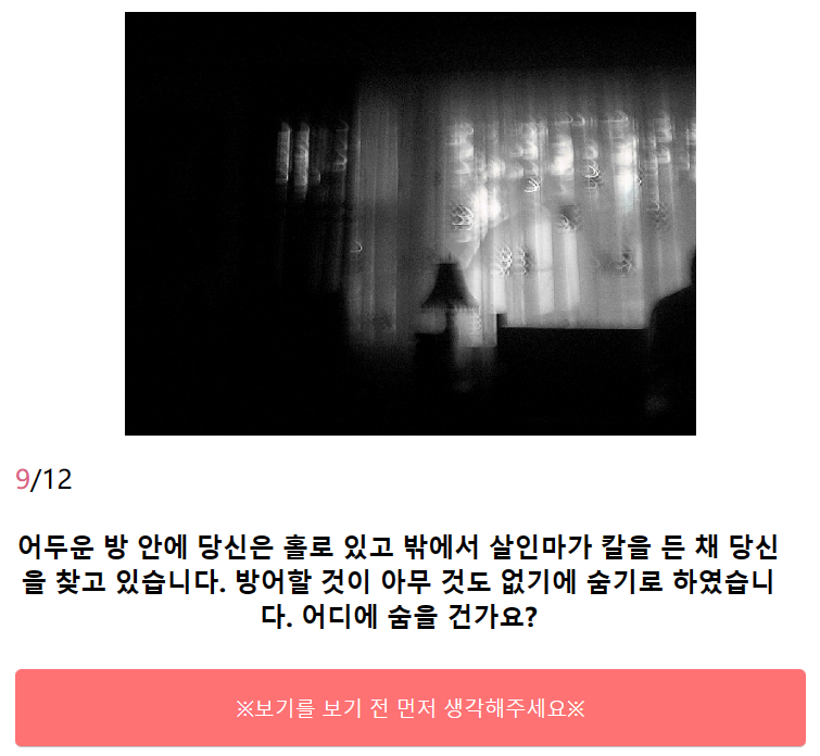 어두운 방 안에 당신은 홀로 있고 밖에서 살인마가 칼을 든 당신을 찾고 있습니다. 방어할 것이 아무 것도 없기에 숨기로 하였습니다. 어디에 숨을 건가요?