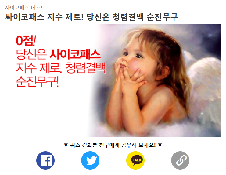 사이코패스 테스트 결과는 0점이 나왔으며, 당신은 사이코패스 지수 제로, 청겸결백 순진무구!가 나왔습니다.