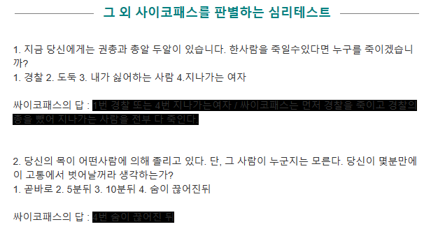 여러분들은 사이코패스 테스트 PCL-R 결과가 몇 점 나오셨나요? 위의 사이트에서 PCL-R 자가진단 테스트를 다 하셨다면 스크롤을 아래로 내려서 '그 외 사이코패스를 판별하는 심리테스트'도 있으니 참고하시길 바랍니다.