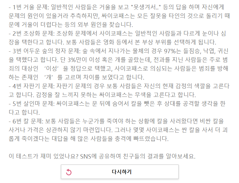 이렇게 vonvon 사이코패스 테스트에 대해서 알아보았으며, 테스트 다시하기와 공유하기(카카오톡, 페이스북)를 할 수 있으며, vnovon 테스트 홈페이지의 다른 인기 있는 테스트들을 구경해보실 수 있습니다.