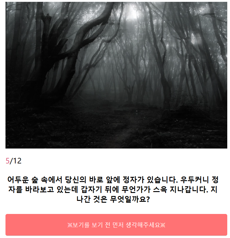 3. 어두운 숲 속에서 당신의 바로 앞에 정자가 있습니다. 우두커니 정자를 바라보고 있는데 갑자기 뒤에 무언가가 스윽 지나갑니다. 지나간 것은 무엇일까요?