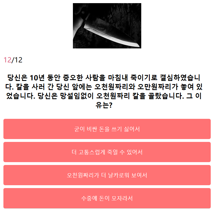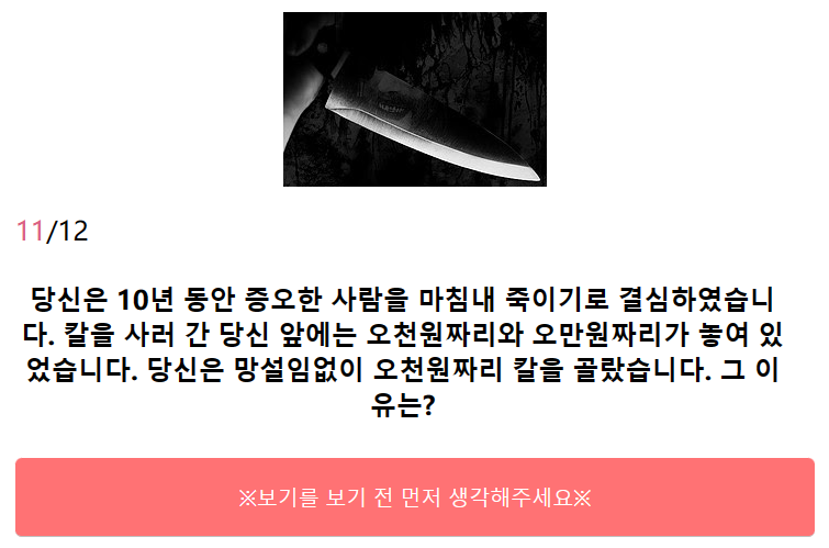 6. 당신은 10년 동안 증오한 사람을 마침내 죽이기로 결심하였습니다. 칼을 사러 간 당신 앞에는 오천원짜리와 오만원짜리가 놓여 있었습니다. 당신은 망설임 없이 오천원짜리 칼을 골랐습니다. 그 이유는?