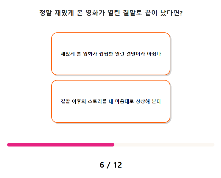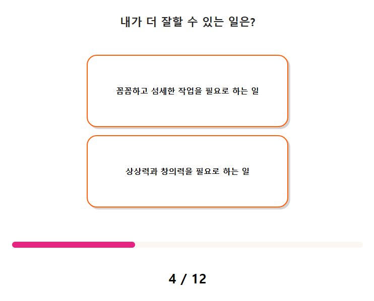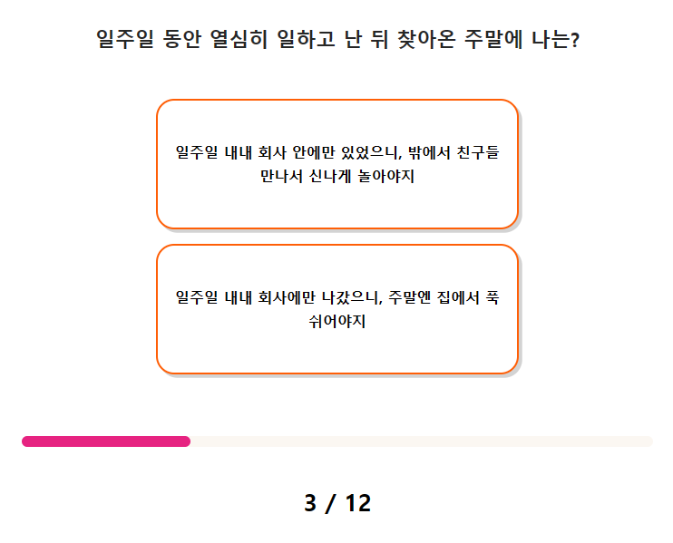 엽서 성격 테스트 질문(문항) 수는 총 12가지이며, 테스트 소요시간은 약 2분 ~ 3분 정도 걸립니다.