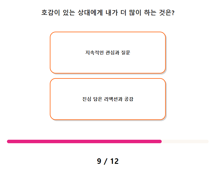 | < 테스트잇 > 짝사랑 테스트 (너를 좋아할 수 밖에 없는 이유 / 짝사랑 테스트 링크 바로가기) (0) | 2023.06.18 |