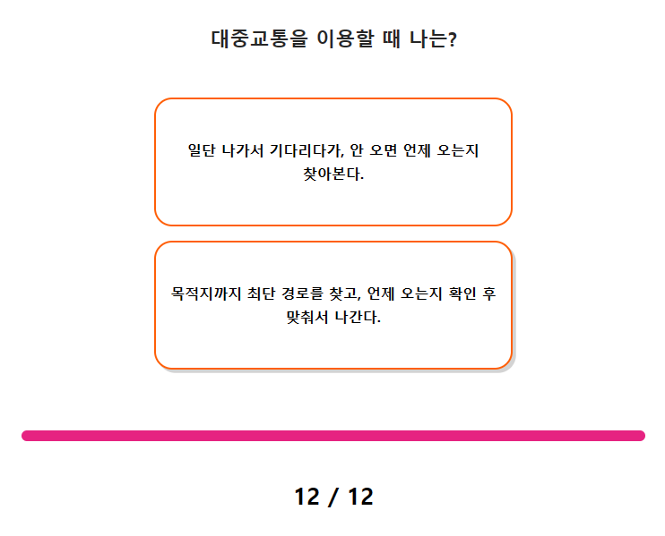 11. 목표를 이루어 나갈 때 나는? 12. 대중교통을 이용할 때 나는?