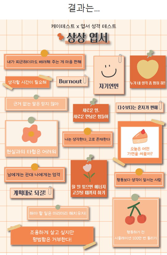 여러분들은 MBTI 성격 유형과 엽서 성격 테스트 결과를 비교했을 때 비슷하게 나오셨나요? 저는 똑같이 나왔는데요. 만약 결과가 다르게 나왔다면 걱정하지 말고 조금씩 다르게 나올 수 있으니, 참고하시길 바랍니다.