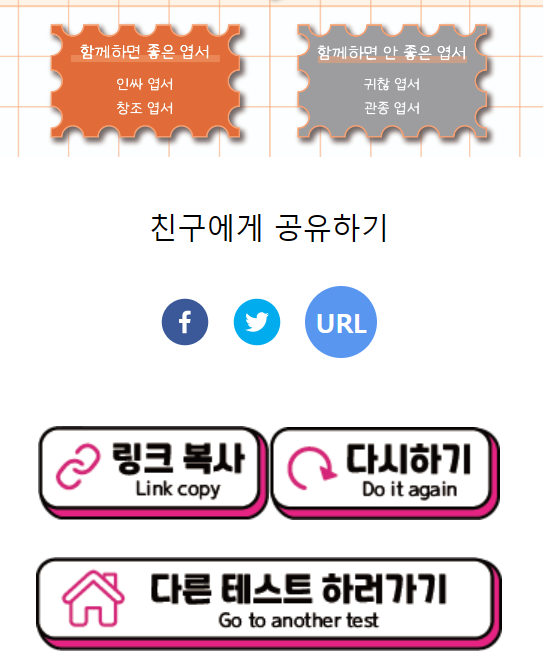 엽서 성격 테스트를 해보았는데요. 여러분들도 자신의 성격과 비슷한 점들이 많이 있으신가요? 엽서 성격 테스트 결과 창에서 스크롤을 아래로 내리면 친구에게 공유하기와 링크 복사하기, 다시 하기, 다른 테스트하러가기 버튼들이 있습니다.