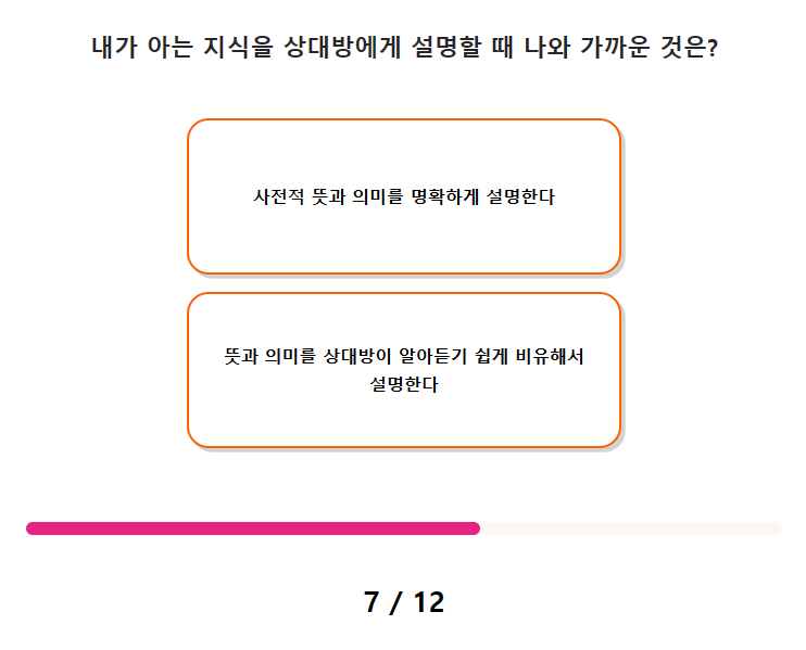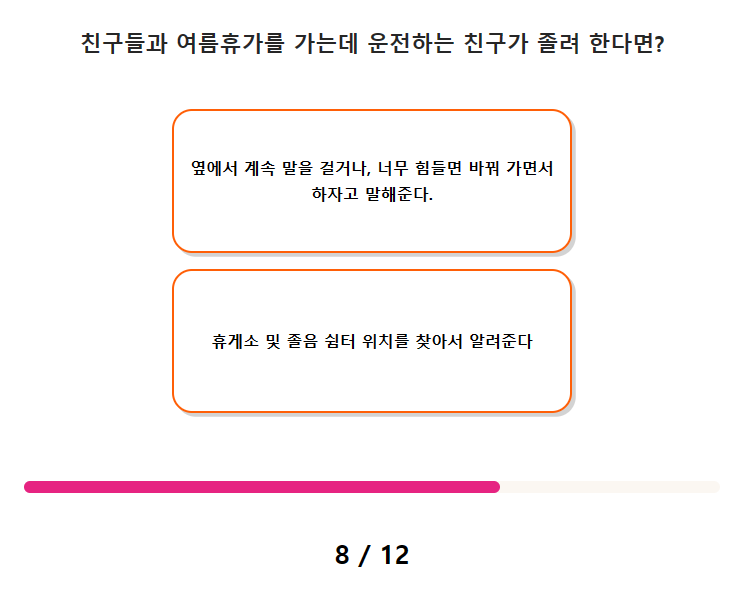 7. 내가 아는 지식을 상대방에게 설명할 때 나와 가까운 것은? 8. 친구들과 여름휴가를 가는데 운전하는 친구가 졸려 한다면?