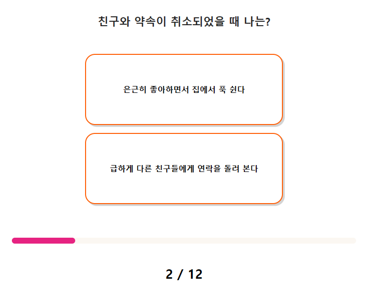 2. 친구와 약속이 취소되었을 때 나는? 1) 은근히 좋아하면서 집에서 푹 쉰다. 2) 급하게 다른 친구들에게 연락을 돌려 본다.