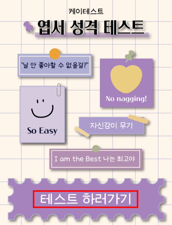 위의 링크를 참고하셔서 엽서 성격 테스트 X 케이테스트 홈페이지에 들어가셔서 '테스트 하러가기' 버튼을 클릭하셔서 시작할 수 있습니다.