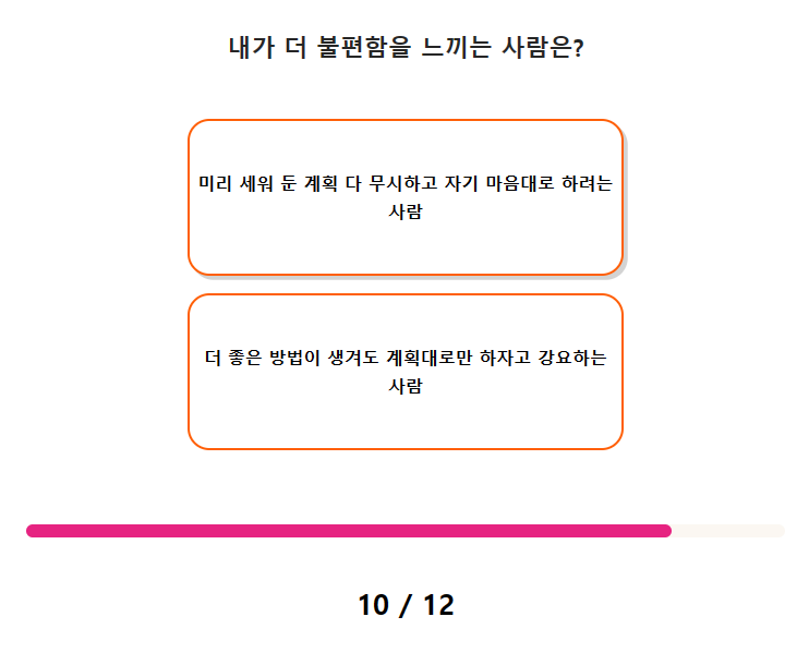 테스트 질문과 답 체크는 간단하게 생각하시고 질문에 답을 고르시면 되므로 나와 잘 맞는 것을 2가지 중 체크하시면 됩니다.