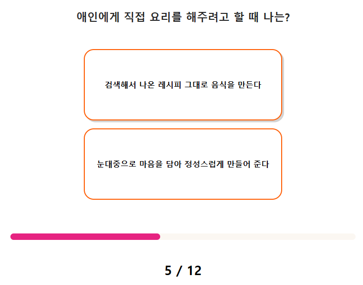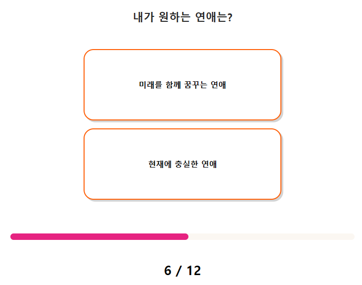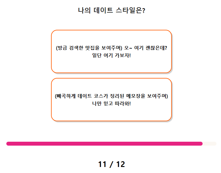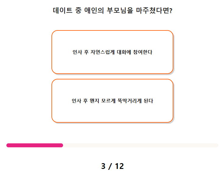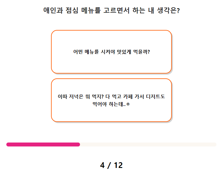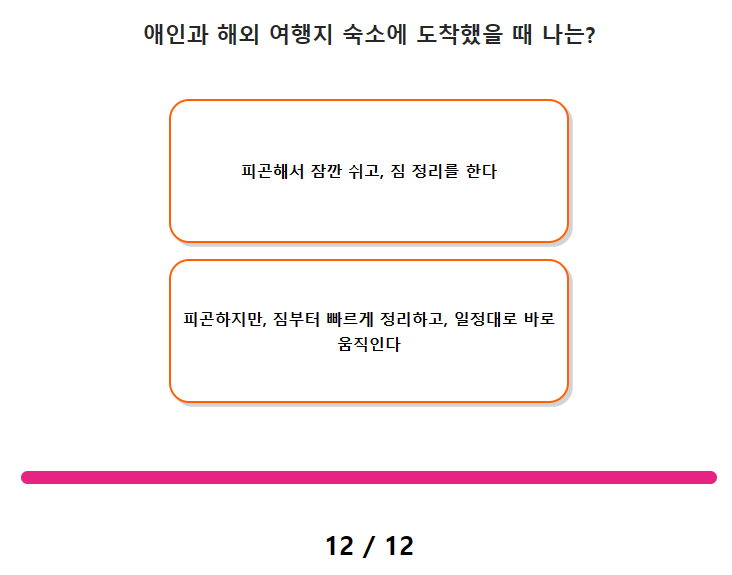 연애 스타일 스티커 테스트 질문(문항) 수는 총 12가지이며, 테스트 소요 시간은 약 2분 ~ 3분 정도 걸립니다.