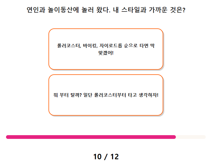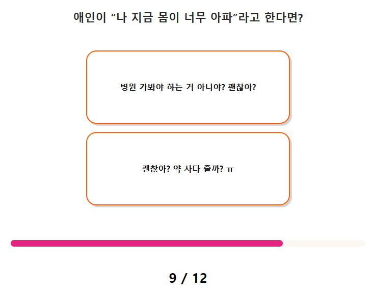 9. 애인이 "나 지금 몸이 너무 아파"라고 한다면? 10. 연인과 놀이동산에 놀러 왔다. 내 스타일과 가까운 것은?