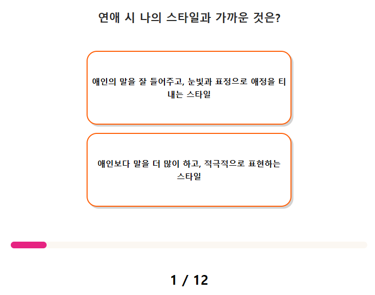 지금부터 연애 스타일 테스트에 대해서 질문들과 결과를 알아보도록 하며, 테스트를 시작해보도록 하겠습니다.