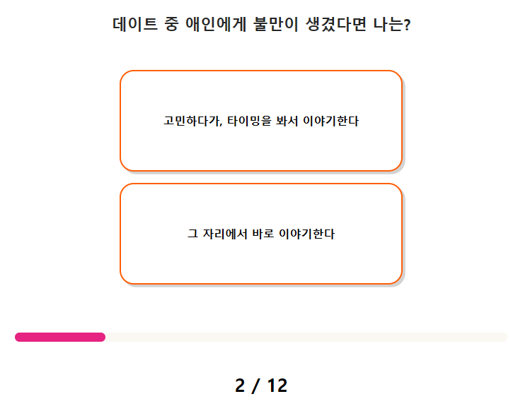 2. 데이트 중 애인에게 불만이 생겼다면 나는? 1) 고민하다가, 타이밍을 봐서 이야기한다. 2) 그 자리에서 바로 이야기한다.