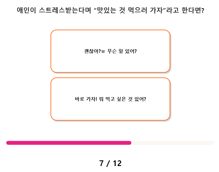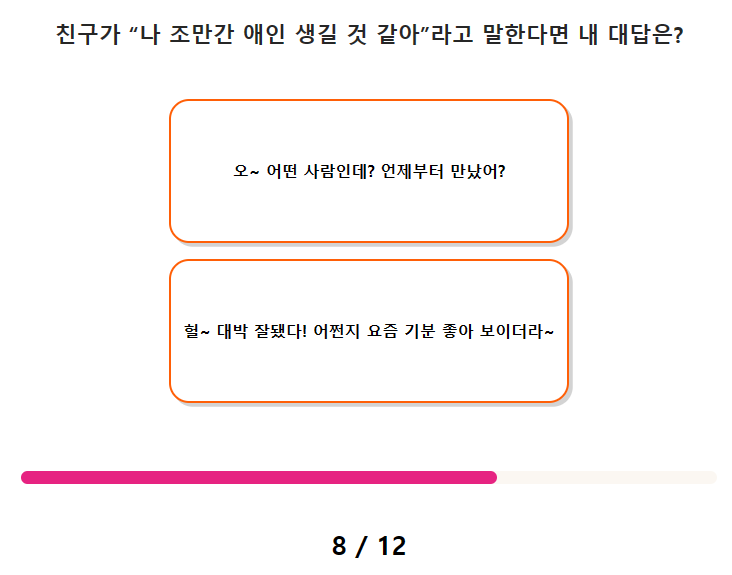 7. 애인이 스트레스 받는다며 "맛있는 것 먹으러 가자"라고 한다면? 8. 친구가 "나 조만간 애인 생길 것 같아"라고 말한다면 내 대답은?