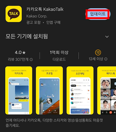 모바일이나 PC 버전의 경우에 '업데이트' 조용한 채팅방 오픈이라고 카카오톡 앱의 상단에 공지사항이 나와 있었습니다. 구글 플레이 스토어나 애플 앱스토어에서 카카오톡 앱을 업데이트 해주시면 됩니다. (수동으로 업데이트를 해주시길 바랍니다.)