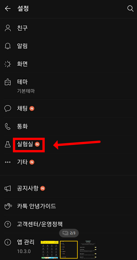 설정 화면이 나왔다면 스크롤을 아래로 내려 '실험실'을 찾아서 터치해주시면 됩니다.