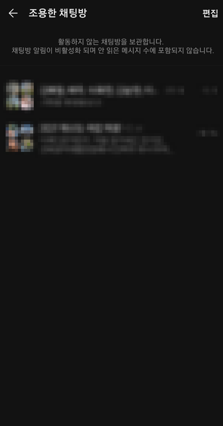 조용한 채팅방에 있는 채팅방 목록은 알림이 울리지 않고 안 읽은 메시지 수 카운트에도 포함되지 않는다는 말입니다.